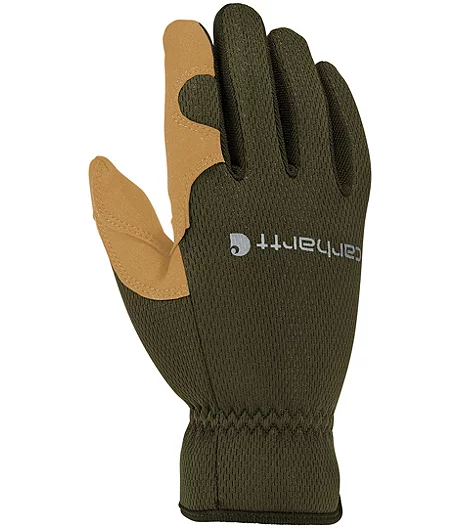A general purpose work glove from Carhartt, this pair is made from breathable mesh with synthetic suede palms. Thumb saddles are reinforced for durability.