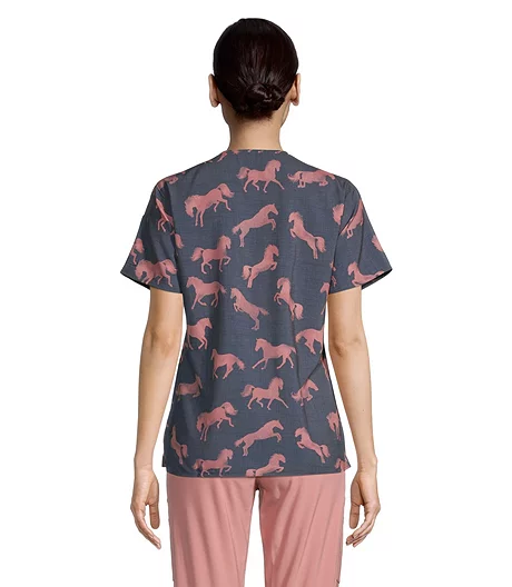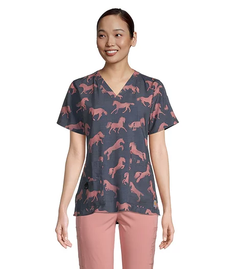 From Carhartt’s latest exciting print collection, this scrub top has a stunning all-over horse pattern. It offers comfort as well as rugged durability in an easy-care polyester blend fabric. This design has multiple pockets, pen slots and D-rings to keep you organized and prepared for the tasks at hand.
