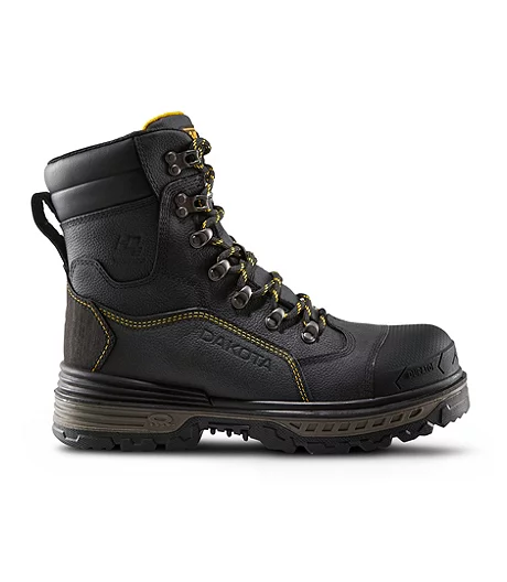 From Dakota, these men’s work boots are made of waterproof leather with protective toe caps. Duratoe® is a flexible and extremely durable molded toe cap applied to the outside of the work boot. It’s built to withstand hard wearing conditions, extending the life of the toe box. These boots also feature our HD3 waterproof membrane to keep feet dry and T-MAX® insulation for added warmth when the temperature dips. Safety features include composite toes and plates and the boots are resistant to electric shock and puncture. Tarantula Anti-Slip® outsoles provide the ultimate in slip protection by reducing the likelihood that you’ll slip and fall on wet and/or greasy surfaces.*