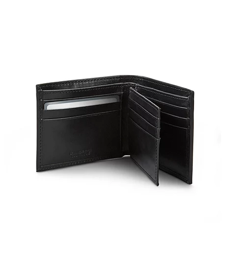 From Dakota, this leather bifold wallet has two currency pockets and nine card pockets for your credit cards, driver license and other similarly-sized cards. RFID technology protects the contents from identity theft. The attached wing also includes a sleeve for your ID card. This wallet comes in a tin presentation box, making it ideal for gift-giving.