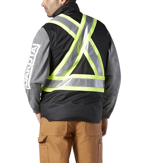 Our Dakota hi-vis vest adds core protection when days turn chilly. It’s made of PU-coated Oxford polyester for water-repellence and fully lined and insulated for extra warmth. This vest features a collar and chin guard lined with microfleece for a soft and comfortable feel against the skin, and a double front placket with hidden two-way, heavy-duty zipper. This vest is fully loaded with Velcro-close and zippered pockets to safeguard all your small essentials. Hi-vis reflective bands keep you safe in low-light environments.