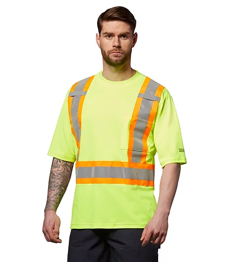 This high visibility Dakota short-sleeve work t-shirt is ideal for outdoor workers on construction sites, truck drivers and warehouse staff. Itβs made in a double-layer fabric, with premium durable and colourfast polyester on the outside and soft, breathable cotton on the inside. The safety tee meets appropriate Canadian standards for visibility with reflective striping on the body and sleeves. The chest stripes include places to carry your ID badge, a cell phone or a radio.