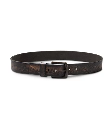 The distressed vintage look applied to this buffalo leather belt makes it ideal for coupling with your jeans. The brass-look buckle is a great match for the old-time look.