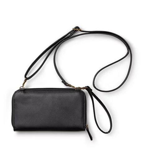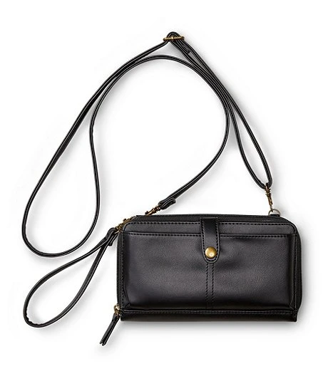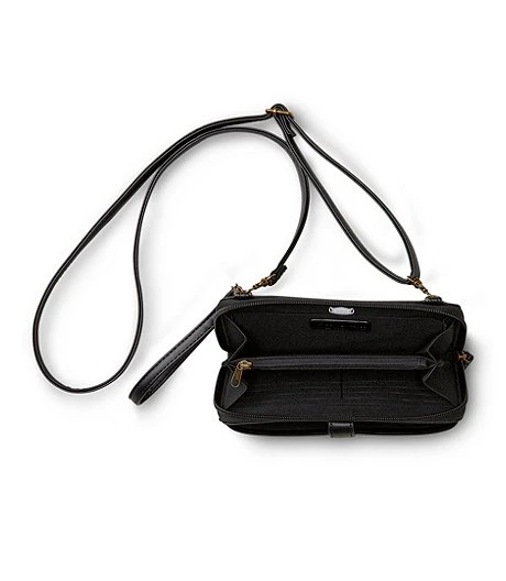 From Denver Hayes, a 3-in-1 convertible crossbody/wallet for stowing your small essentials. The zip-around bag has a front tab phone pocket, adjustable shoulder strap, removable wristlet and RFID protection.