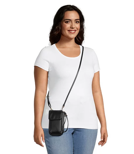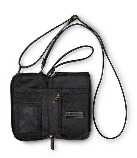 From Denver Hayes a crossbody wallet with a flap-front magnetic closure phone pocket. This bag has 6 credit card slots, a bill compartment and zippered coin pocket. Includes a removable wristlet and a detachable/adjustable shoulder strap.