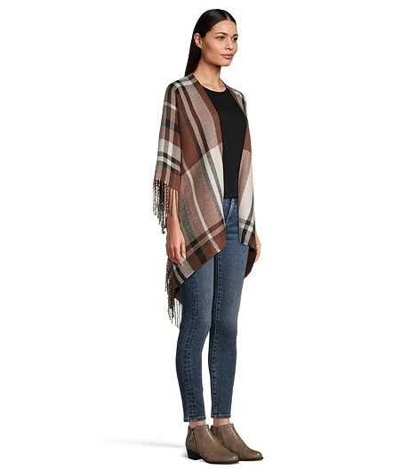 A classic plaid ruana from Denver Hayes, you can wear it over a sweater or your winter coat. The fringed edging creates a lovely finish over your arms.
