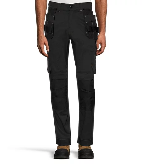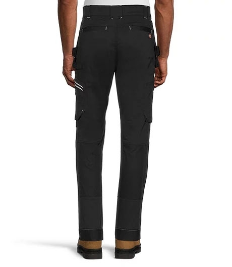 Tough and ready for work, these Dickies stretch pants come in a regular fit with oversized belt loops. A gusset at the crotch allows improved flexibility and ease of movement. The pants include convenient top-loading knee pad pockets and hemguards reinforced with Cordura® fabric for durability. These work pants have multiple pockets for holding small work tools.