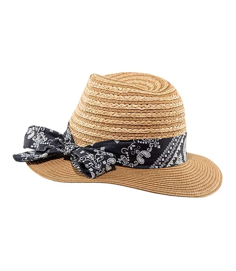 We tied a printed bandana around our FarWest straw hat to give it a casual and carefree look. The lightweight straw hat is perfect for your outdoor summer activities.