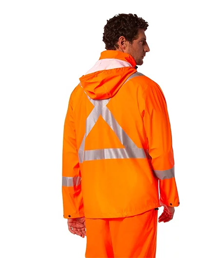 Available in Hi Vis orange to ensure that coworkers and drivers can see you at all times, this Helly Hansen Workwear ALTA rain jacket is a great choice for dark and stormy days on the jobsite. The menβs jacket is crafted with waterproof fabric and construction to keep you protected from the elements. The fabric is PU coated for added durability and it features 3M reflective detailing for enhanced safety. The jacket has a high stand collar and a packable hood with drawcord adjustment.