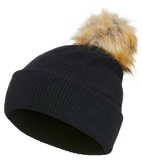 Fine rib-knit toque with faux fur pompom. Fully lined with fleece, it features a turned-up brim for maximum warmth.