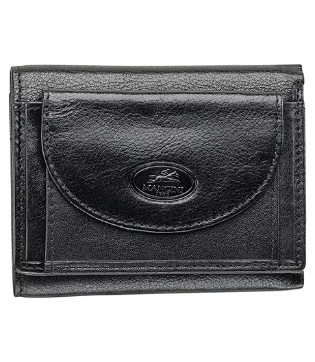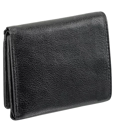 This convenient trifold wallet features an external coin pocket. The interior includes multiple credit card slots and a double bill section. This fine leather wallet exudes classic elegance.