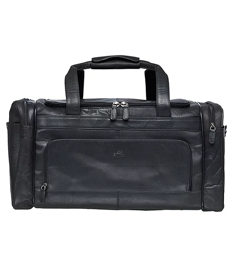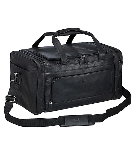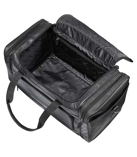 This luxurious and versatile carry-on duffle bag features a large main compartment and multiple zippered and slit pockets. The rear is equipped with an add-a-bag strap to piggy-back the duffel on other baggage.