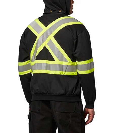 Keep warm on the job wearing this high visibility FR cotton hoodie. A practical work jacket, it features two handy front pouch pockets to store all your workday essentials, as well as a durable brass zipper closure and a detachable snap hood.