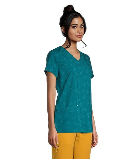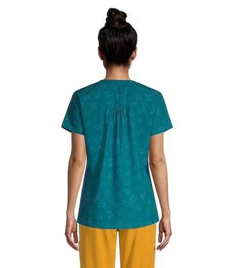 A simple but smart scrub top design from Scrubletics. The gathered back panel and hem slits give you extra room to move around the shoulders and hips, and roomy pockets take care of your work essentials.