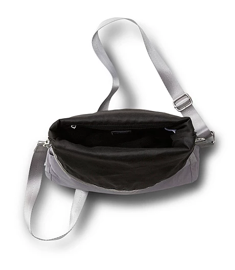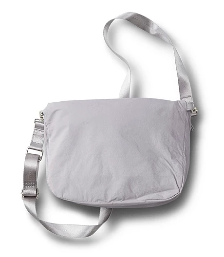 From Shambhala, a cross-body bag in nylon with silvertone metal hardware. The strap is adjustable for personal comfort. This bag has a hidden zippered pocket where you can safeguard important cards and other essentials.