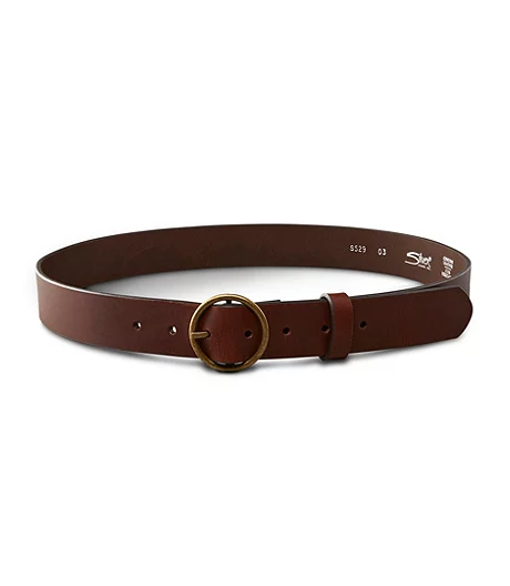 From Silver Jeans, this smooth genuine leather belt has a circular-shaped centre-bar buckle in an antique brass finish. The perfect complement for your Silver jeans.