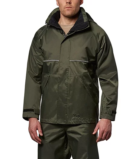 When you want to stay dry and protected on the worksite, this weather-resistant jacket does the job. It comes with an extra-large, fleece-lined collar for optimum coverage against the biting wind and a roomy three-piece hood to keep the rain off your head. Itβs finished with large vents on the front and back to prevent over-heating and safety piping on the front and back to keep you visible.