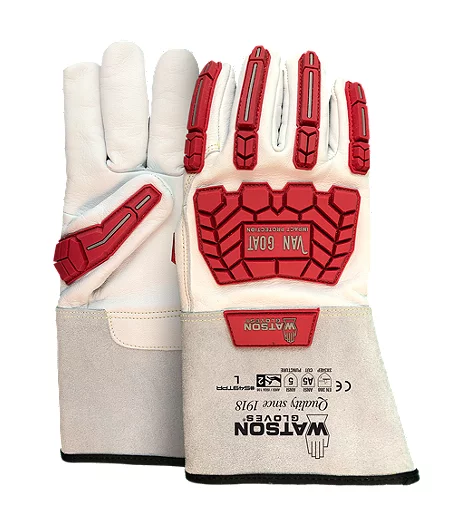 Full sock Cutshield™ Paramid/steel/polyester liner for superior protection, ANSI A5. Hard-wearing full-grain goatskin leather offers exceptional strength and dexterity. Heavy duty rubber on back of hand, fingers and wrist provides impact protection. Classic gunn cut with wing thumb has seams set away from working area of fingers for a comfortable fit. Stitched with Kevlar thread provides strength and durability. Gauntlet style cuff for additional wrist and forearm protection.